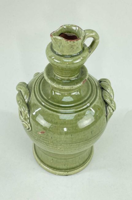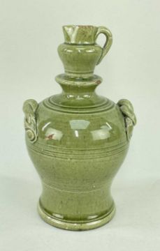 EWENNY POTTERY MONEY BOX in green glaze, applied rope-twist handles, finial in the form of a miniature jug with loop handle, sgraffito inscribed 'Miriam Morgan' over a trailing vine, incised Ewenny Pottery to base, 17.5cms high