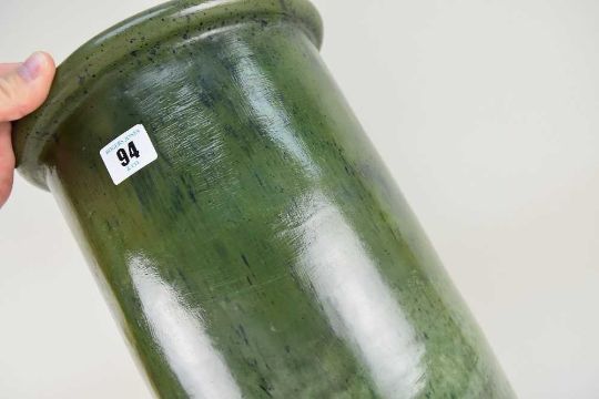 EWENNY POTTERY MOTTLED GREEN GLAZE CYLINDRICAL UMBRELLA STAND, with rounded lip and foot, the base inscribed 'Ewenny Pottery 1918', 51cms high