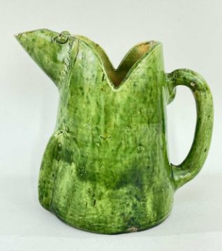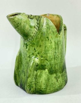 EWENNY POTTERY ZOOMORPHIC JUG IN THE FORM OF A CARICATURE PIG, in a mottled green glaze, 18.5cms high