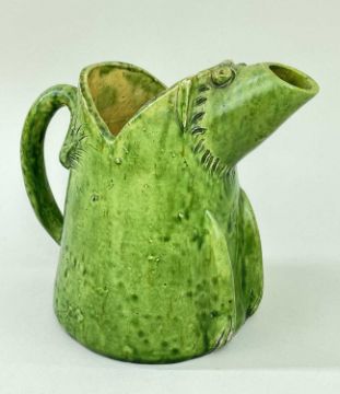 EWENNY POTTERY ZOOMORPHIC JUG IN THE FORM OF A CARICATURE PIG, in a mottled green glaze, 18.5cms high