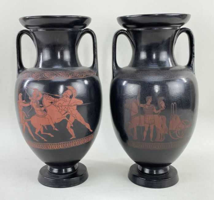 RARE PAIR OF SWANSEA DILLWYN ETRUSCAN POTTERY PELIKE VASES 1847-1850, of Classical Italo-Greek form having twin vertical handles, bellied body, turned neck and foot, the red earthenware body printed in black outline with soldier standing beside a horse and chariot, opposing side with battle scene of archer, foot-soldier and horse-mounted figure , printed mark to base reads 'Dillwyn's Etruscan Ware' in scroll cartouche, 37.5cms high (2)