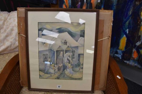 JEAN YOUNG (British, 1914-1995) mixed media - figures outside house with offerings, titled verso 'The Gift', signed, framed and glazed, 39.5 x 31cms
