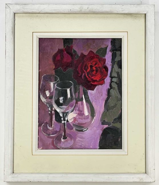 BRYN RICHARDS (b.1922) oil on board - still-life of roses and glasses, unsigned, 30 x 21.5cms
