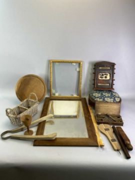 TREEN - parcel of vintage items including an oak desk calendar, mirror, foot stool, old scales, ETC