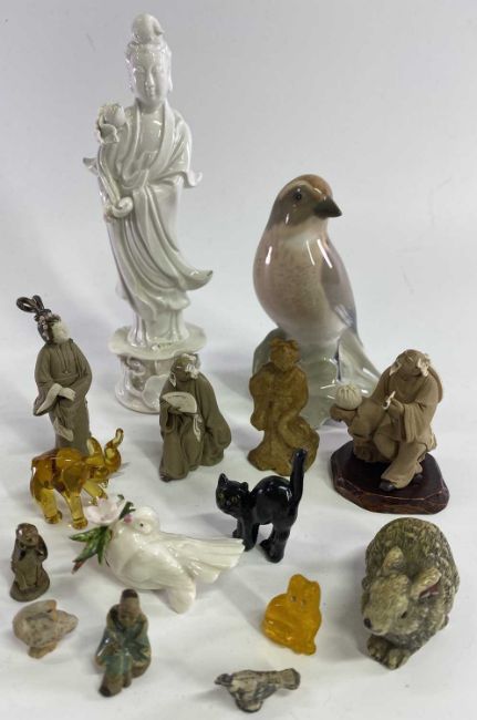 CONTINENTAL/ORIENTAL & OTHER CABINET FIGURINES, BIRDS & ANIMALS - a small collection to include a Blanc de Chine figure holding a lotus flower, 16cms H, Copenhagen porcelain model of a bird, 11cms H, Capodimonte dove miniature, Japanese miniature figurines and other interesting items
