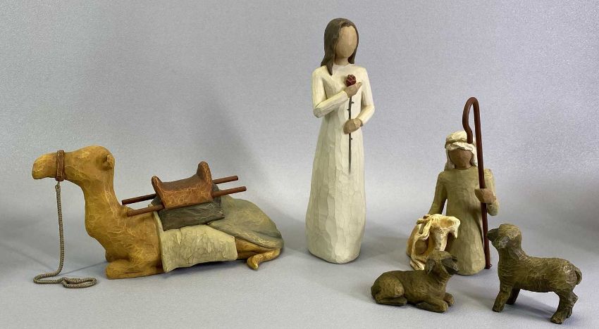 CARVED BOAR ORNAMENTS, 2 SIMILAR,15cms H x 32cms L and Willow Tree ornaments including camel, shepherd and sheep, ETC