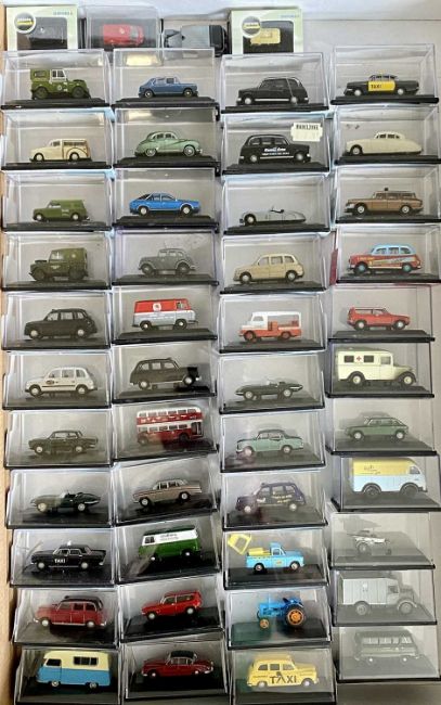 OXFORD DIECAST VEHICLES 1:76 SCALE & N GAUGE - 44 and 4 respectively, all but one appear mint, in original packaging and perspex display cases, vehicles include London cabs, Walls Ice Cream van, Chipperfield Circus taxi, Walls Ice Cream Anglia and other interesting vehicles