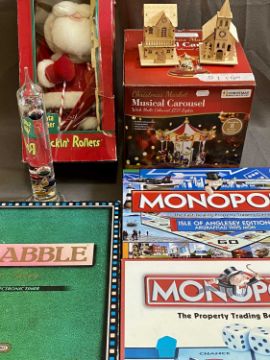 BOARD GAMES, CHRISTMAS ORNAMENTS, Galileo glass thermometer, games to include two sets of Monopoly, one being the Isle of Anglesey Edition, Spears Games Scrabble Deluxe with electronic timer, the ornaments include a Rockin Rollers Santa Skier, musical carousel with multicoloured LED lights, both boxed and two small hand built wooden ornaments, 33cms H the thermometer