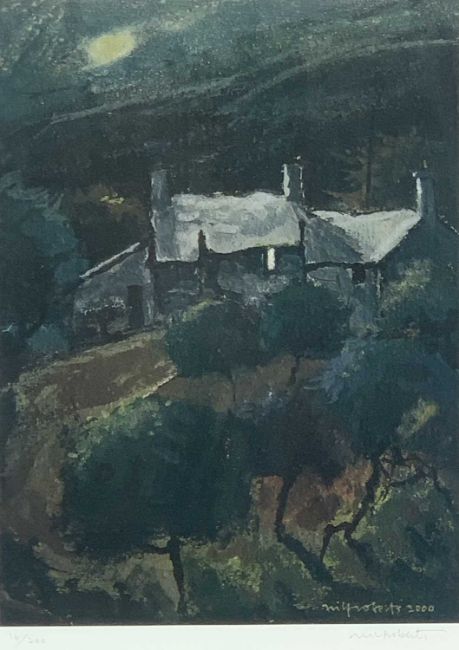 WILF ROBERTS coloured limited edition (16/200) print - Anglesey hillside cottages, signed in full, 34 x 28cms