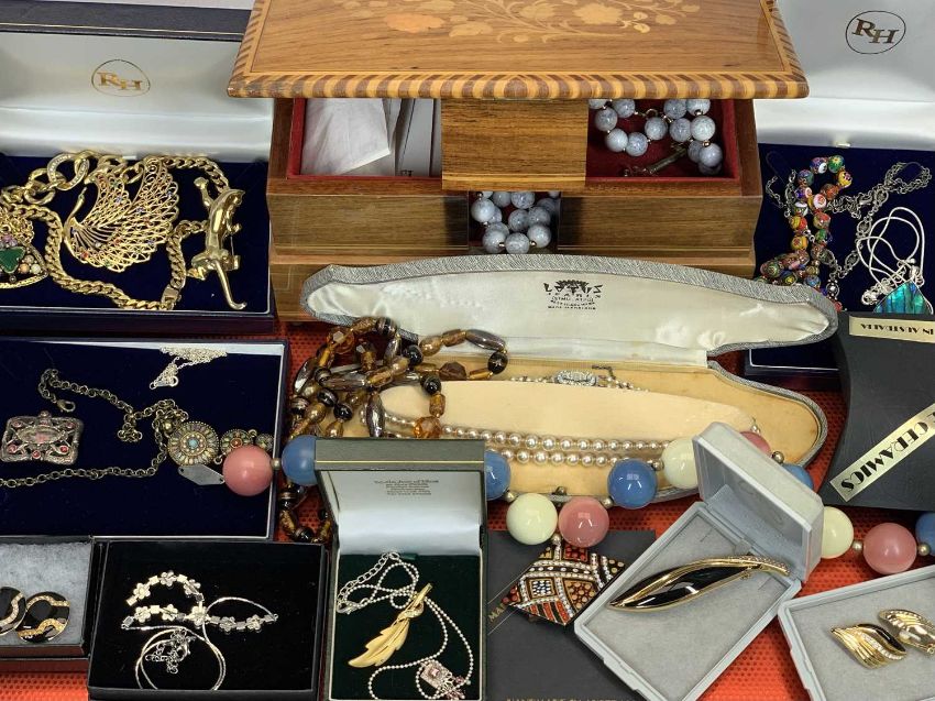GOLD TONE, 925 SILVER & STYLISH VINTAGE & MODERN COSTUME JEWELLERY - within an Italian type inlaid musical jewellery box, displayed upon three trays