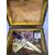 TREEN - rosewood work box with miscellaneous contents and a ram's horn