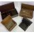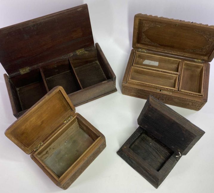 JAPANESE LACQUER WORK PANELS (4) - to include two black Shibayama type having the relief detail inlaid in bone, 60 x 35.5cms and a pair of red and black lacquerwork panels inlaid with Abalone and mother of pearl, 60.5 x 36cms, CARVED & OTHER WOODEN BOXES (4) - to include an Indian hardwood example showing African hunting scenes, 8.5cms H, 25cms across, 14.5cms D, another carved with leaves and fruit, 10cms H, 16.5cms across, 11cms D, a mahogany lidded box with rear carry handle and interior dividers, 31cms across and a book form box with iron hinges, 7.5cms H, 15cms L, 12.5cms across and REGENCY ROSEWOOD ADJUSTABLE FIRESCREEN - with lift-up shelf back, 95cms overall H, 52cms W, 33cms D
