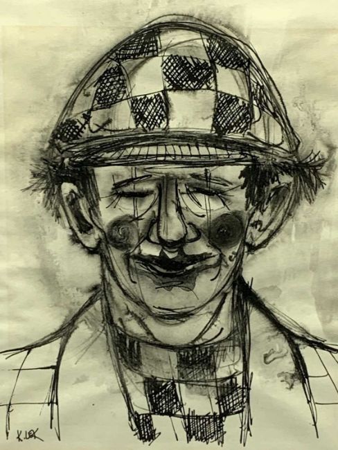 KAREL LEK pen and ink portrait - a hatted jockey or clown, signed, 26 x 20cms