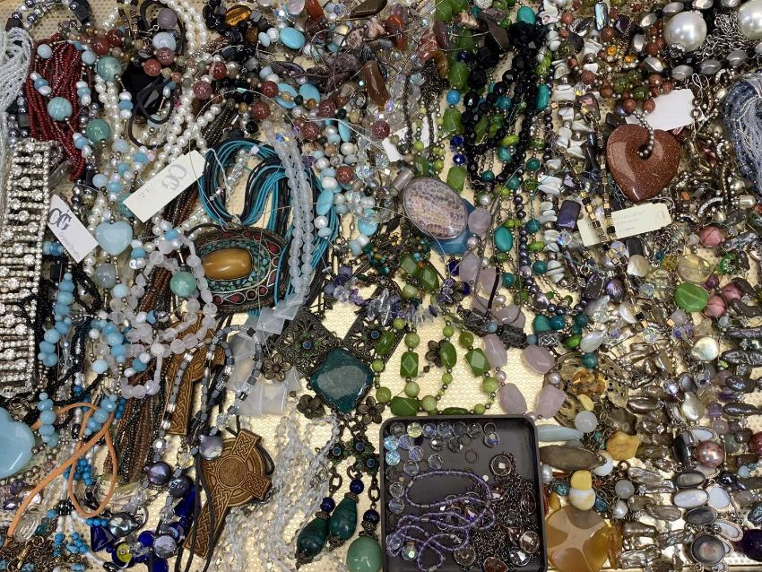 QUALITY COSTUME JEWELLERY COLLECTION - as displayed on two trays to include colourful diamante, gold stone, lapis, agates and other hard stones, mainly in necklace form along with a one or two tiaras and other interesting individual items