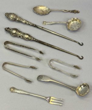 GORGE III & LATER SMALL SILVER, 9 ITEMS - to include a London 1805 sugar sifter spoon, Maker Solomon Hougham, plain pair of sugar tongs, London 1899, Josiah Williams & Co, decorative jam spoon, Sheffield 1907, James Dixon & Sons and 6 further items, various Birmingham hallmarks including an openwork pair of sugar tongs, 1903, Male & Jones,4.2ozt weighable