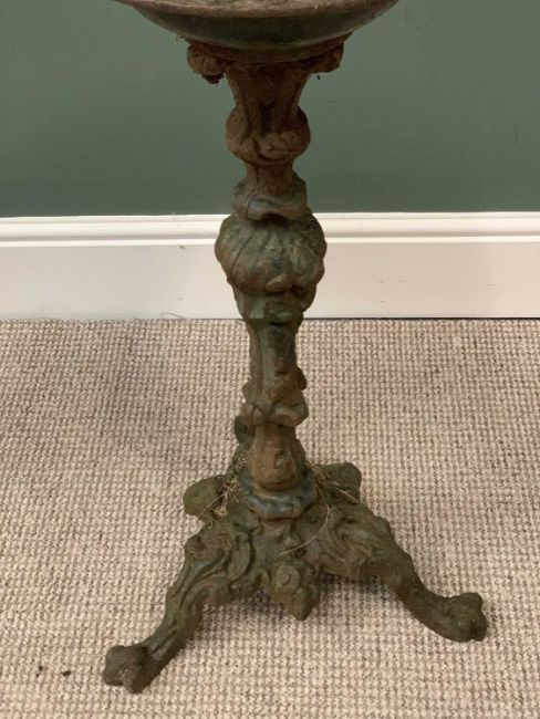 VICTORIAN CAST IRON BIRD BATHS, a pair, on tripod bases, 74cms H, 30cms diameter