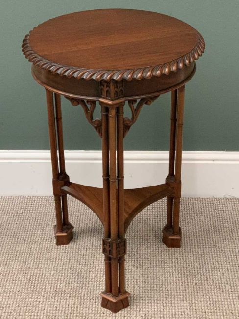 REPRODUCTION MAHOGANY OCCASIONAL TABLE - circular top with rope edge moulding on triple column turned supports and lower stretcher, 70cms H, 46cms diam