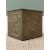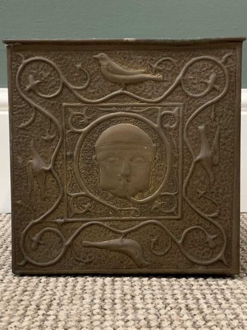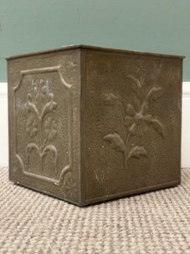 PAIR OF BRASS ORNATE FIRESIDE DOGS, a square brass planter, a pair of floral decorated ceramic plaques, 63cms H, 24cms W