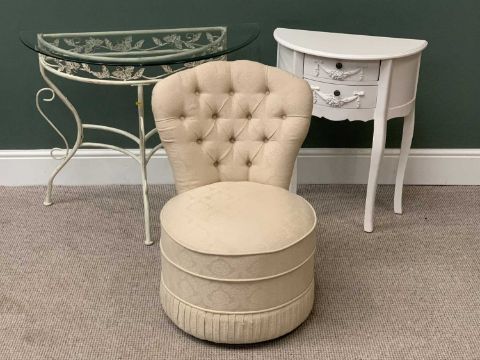 METAL HALF MOON TABLE WITH GLASS TOP, another wooden with two drawers and an upholstered button backed bedroom seat