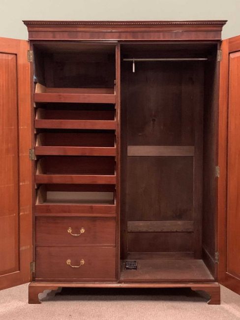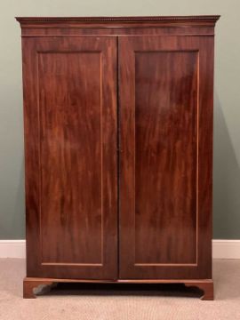 VICTORIAN MAHOGANY TWO DOOR WARDROBE - with dentil moulding cornice on shaped bracket supports and a fine fitted interior having sliders and drawers, 198cms H, 136cms W, 58cms D