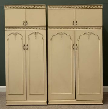 FRENCH STYLE BEDROOM SUITE - comprising 'His n Her' wardrobes, 225cms H, 123cms W, 54cms D and 225cms H, 92cms W, 54cms D, chest of five drawers, 84cms H, 79cms W, 47cms D and a dressing table with triple mirror, 140cms H, 133cms W, 51cms D, a similar style stool and ottoman (Jarman & Platt label)