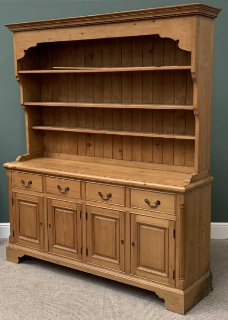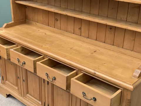 ANTIQUE STYLE PINE DRESSER - a substantial farmhouse type with four drawers over four cupboard doors and an upper three shelf rack, 213cms H, 180cms W, 50cms D