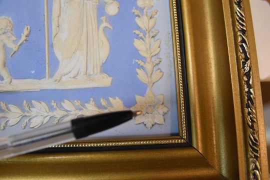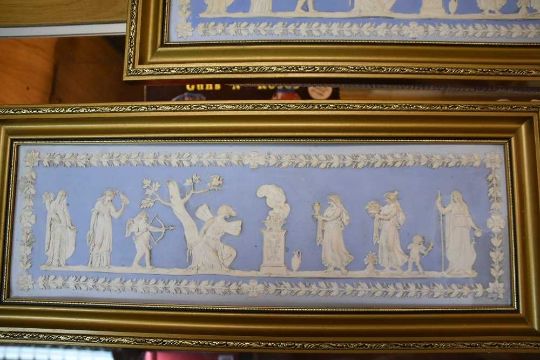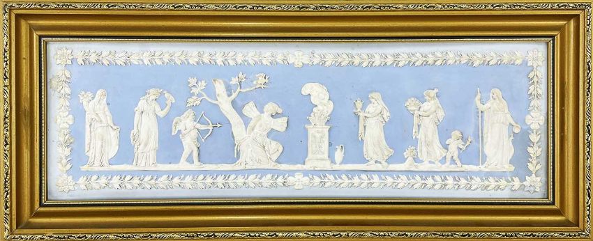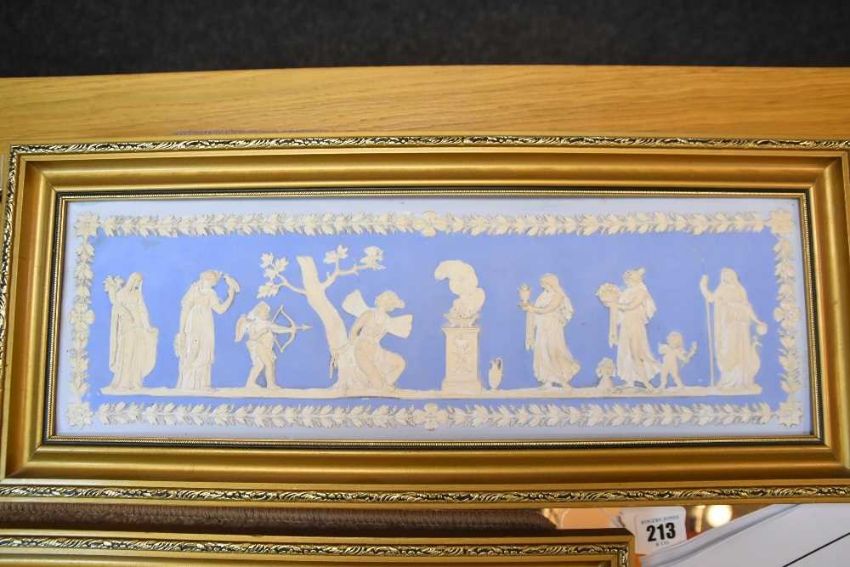 PAIR WEDGWOOD STYLE CLASSICAL REVIVAL PLAQUES, decorated in the 'Jasper' style with classical figures including Cupid and Psyche before a burning altar, 14 x 44cms (2)