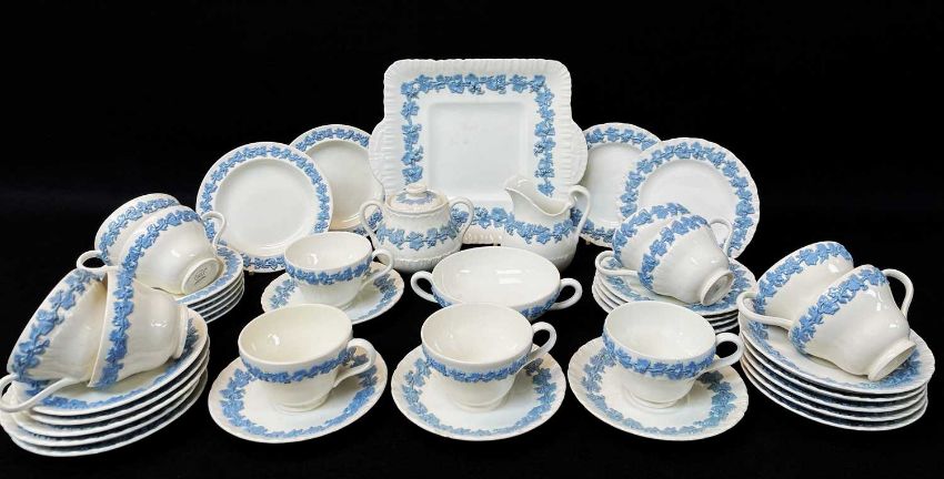 WEDGWOOD 'QUEENSWARE' BLUE & WHITE MOULDED PART TEA SET, comprising twelve cups, seven circular plates, six feather edge plates, feather edged sandwich plate, fourteen feather edged saucers, milk jug, sugar basin and cover, soup bowlComments: some staining and chips, soup bowl with crack