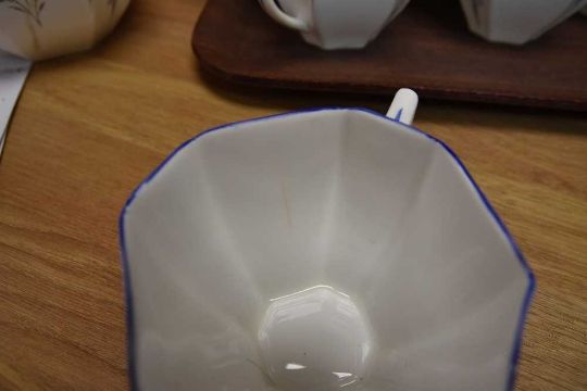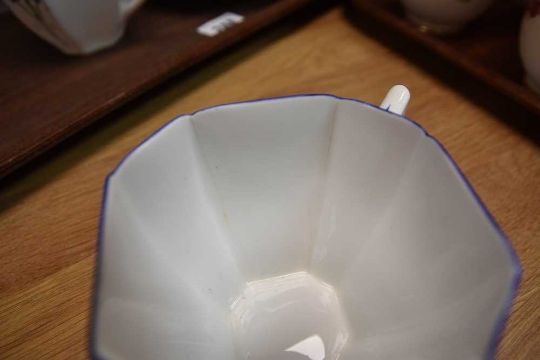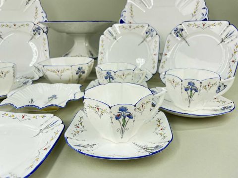 SHELLEY 'BLUE IRIS' PATTERN BONE CHINA PART TEA SERVICE, comprising 7 cups, 12 saucers, 11 side plates, 2 bread and butter plates, tazza, butter dish, sugar bowl