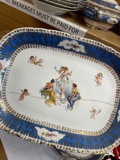 CONTINENTAL PORCELAIN PART DINNER SERVICE, colour-printed with classical figures allegorical of the Arts, blue botders, gilt rocaille rims, including 2 veg tureens, sauce tureen, meat platters and dishes (42)Comments: gilt worn, some items cracked/chipped.Condition Report:The square tureen has a lid chip. All other tureens look good, no damage.Three of the dinner plates have star cracks on the underneath.One dinner plate has restoration.The larger plater also has restoration.The other three platters look good, no damage.The ladle is missing from the gravy boat.There is no other damage to the other pieces.All pieces have gilt wear.