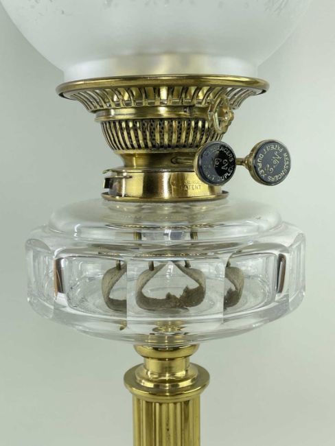 VICTORIAN GILT BRASS, CUT & FROSTED GLASS OIL LAMP, 69cm high (incl. funnel)