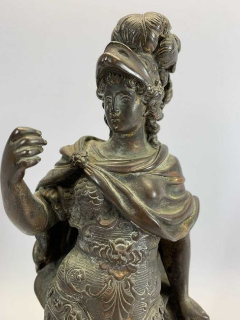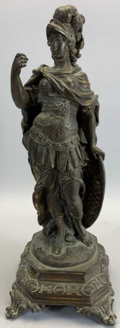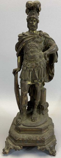 BRONZE CLASSICAL MILITARY FIGURES, A PAIR - on stepped four footed plinth stands, 36cms tall