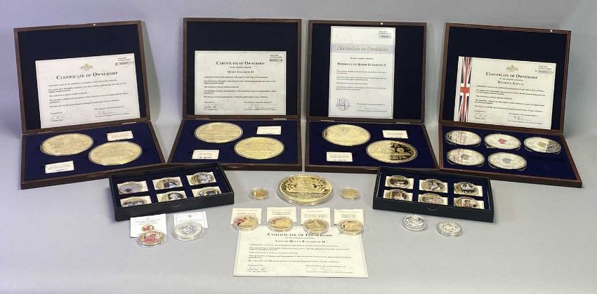 WINDSOR MINT COIN COLLECTION H M QUEEN ELIZABETH II - to include a cased set of five large strike diamond and other Jubilee coins, 7cm diameters with paperwork and outer sleeve, three cased pairs of Jumbo strikes to include 90th Birthday, Longest Reigning Monarch, Coronation, Birthday 21st April 1926, 90th Birthday and Supreme Governor of the Church of England, all cupronickel gold plated, 10cm diameters with paperwork and outer sleeves, two boxed sets of six Diamond Jubilee coins, 4cm diameters, cupronickel layered in 24ct gold with pad prints, with certificates in original presentation boxes with outer sleeves along with a quantity of loose coins including a further Jumbo Strike for Head of the House of Windsor, 10cms diameter in gold plated cupronickel, Coronation, Trooping the Colour, Proclamation of Ascension coins from the life of Queen Elizabeth II Collection, Solomon Islands half dollar 95th Birthday in fine silver plated iron, 2019 five pounds, 2020 five pounds, 2016 90th Birthday Commemorative, gold plated Queen Victoria five pounds copy, most with related certificates along with two RAOB Golden Jubilee coins 2002, all the coins in protective plastic capsules