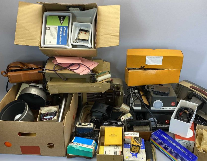 PHOTOGRAPHY - a good assortment of camera and developing equipment to include Kodak Brownie 8-58 projector, Leitz slide projectors, Coronet camera, Pentax, Gnome enlarger, ETC