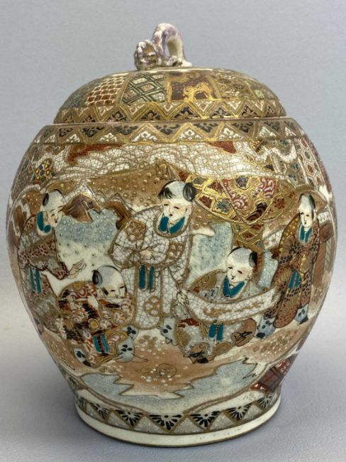 JAPANESE SATSUMA LIDDED GINGER JAR - 21cms H, 11.5cms diameter base