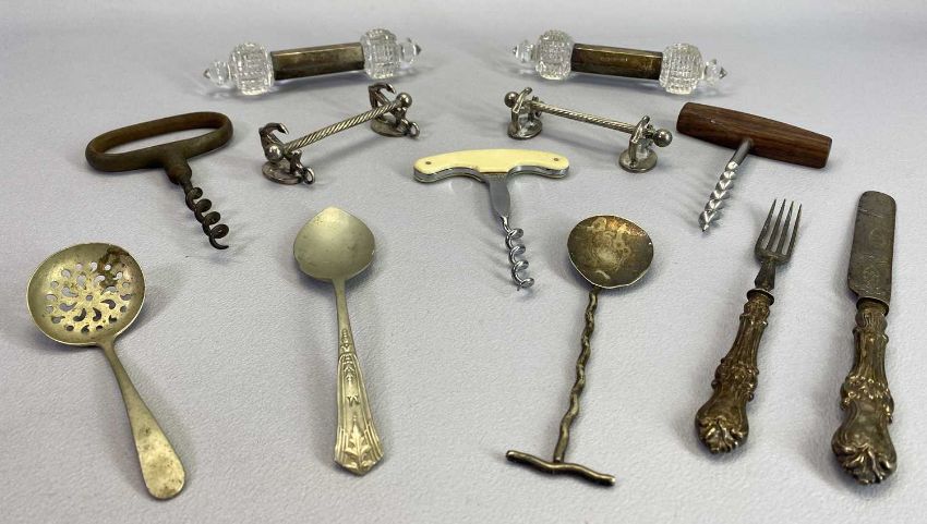 SILVER & GLASS KNIFE REST, EP knife rest, vintage corkscrews and loose cutlery group, the knife rests include a hobnail cut glass pair with hallmarked silver centres, Birmingham 1904, Maker Hilliard & Thomason, 13.5cms L, the EP pair modelled as anchors on oval bases with twist bar centres, 9.5cms L, one of the corkscrews in chrome and plastic stamped 'John Watts, Sheffield, England'