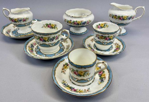 CROWN STAFFORDSHIRE 70 PIECE TEA & COFFEE WARE SET - having a blue and white double banded pattern with floral swags to include large and small cups, coffee cans, various size saucers and side plates, ETC