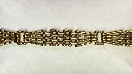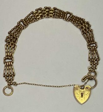 9CT GOLD FANCY GATELINK BRACELET with chase decorated padlock clasp and safety chain, 16cms L approximately, 17.8grms gross