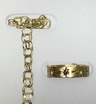9CT GOLD JEWELLERY, 4 ITEMS to include an 8cms L double circular link bracelet, 2.7grms, turquoise and pearl set ring, size J, 2.6grms, bright cut band ring set with red and white colour stones, attached 9ct size reducer, Size J, 3.2grms and a dress ring with central blue sapphire surrounded by pastes, fitted with 9ct size reducer, Size J, 2.8grms