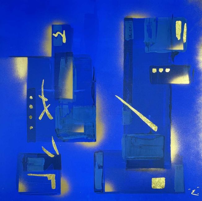 FOUR ORIGINAL ACRYLICS comprising UNKNOWN box frame construction entitled 'Sunset on the Square', signed with initial 'E', 77 x 77cms, LINDA CHARLES acrylic - semi abstract with gold leaf, 54 x 54cms (mounted but unframed), IAN W. KING acrylic x 2 - abstract shapes with gold relief decoration, signed, 50 x 50cms (unframed) (4)