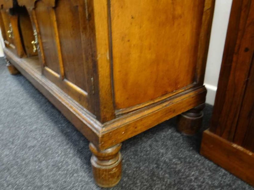 LATE GEORGE III OAK DRESSER BASE, plank top above three frieze drawers, cupboards and dog kennel base, later turned feet, 82h x 145w x 44cms