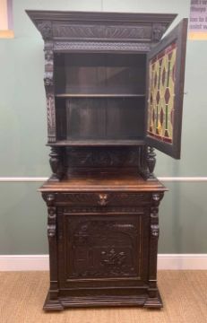 FLEMISH CARVED OAK NARROW CABINET, later leaded and glazed cupboard door between carved uprights with Angel heads raised on carved short columns above cupboard base, fitted frieze drawer and panelled door carved with tavern scenes between lion mask uprights, plinth base, stile feet, 233h x 106w x 54cms