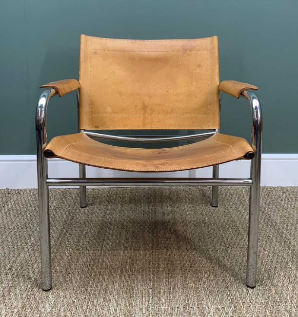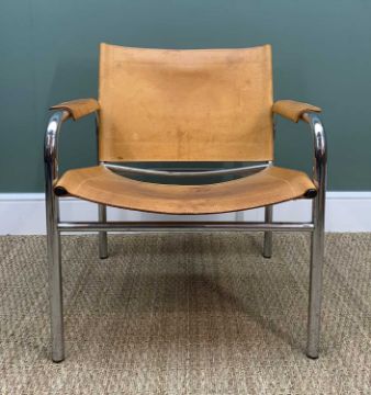 RETRO LEATHER & CHROME KLINTE LOUNGE CHAIR BY TORD BJORKLUND, circa 1980's, tanned leather back seat and arms on chromed metal support, 76cms high