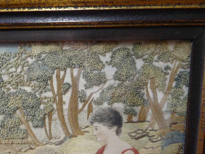 REGENCY SILKWORK PICTURE, depicting a shepherdess in a rural landscape, with figure and church in the distance, worked in satin and moss stitch, 30 x 23.5cms