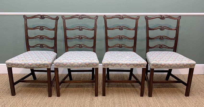 SET OF SIX GEORGE III STYLE LADDER-BACK DINING CHAIRS, moulded square section legs and uprights stuff-over serpentine seats (6)Comments: armchairs with cream damask upholstery, others with Morris-style upholstery, some minor scuffing to top rails