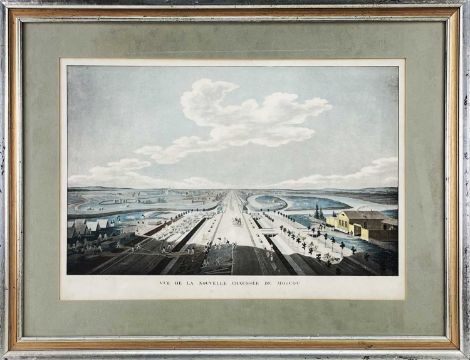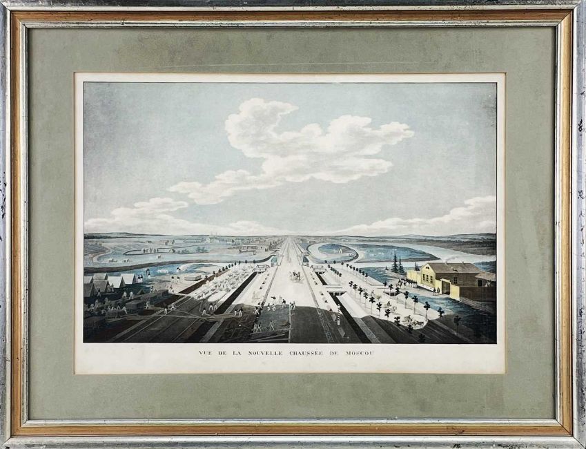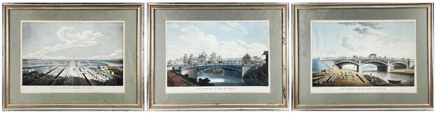 19TH CENTURY FRENCH SCHOOL set of three lithographic plates - military / engineering interest, titles to margin 'Vue Perspective du Pont De Lubani', 'Vue Perspective du Pont de Babina', and 'Vue de la Nouvelle Chaussée de Moscou', framed and glazed, 40 x 58cms