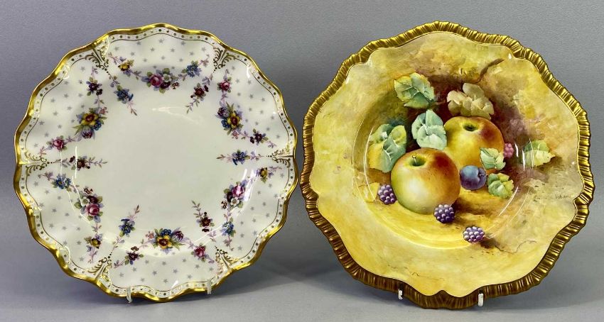 MIXED POTTERY & PORCELAIN GROUP - to include a 27cms diameter Caverswall hand painted fruit plate, signed 'Shufflebotham', Royal Crown Derby 'Royal Antoinette' cabinet plate, 26cms diameter, Doulton Seriesware, Price cottage biscuit barrel and other interesting items