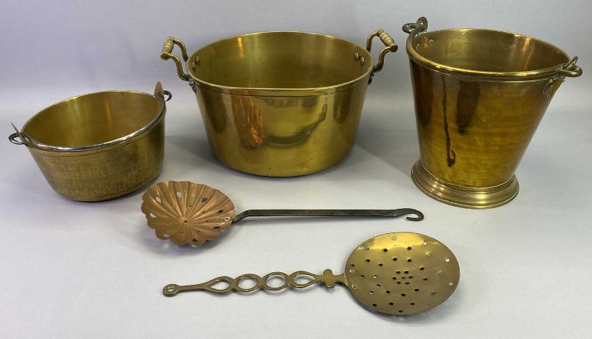 ANTIQUE & LATER BRASSWARE & COPPER UTENSILS - to include two preserve pans, one having twin handles, 42cms across, the other with iron swing handle, 24cms across, brass bucket with swing handle stamped 'Narang', 24cms H and two mixed metal skillets