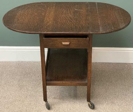 VINTAGE OAK BARLEY TWIST GATE LEG TABLE, 73cms H, 122cms W (open) and a similar era TEA TROLLEY with end drawer and side flaps, 70cms H, 101cms (open), 61cms D