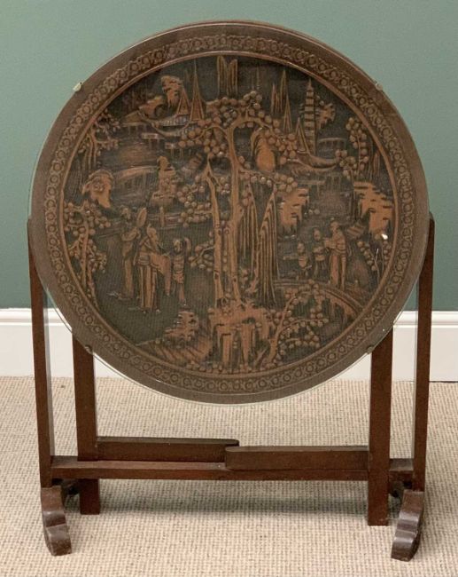 CHINESE CARVED CIRCULAR TOP FOLDING TABLE, 63cms H, 72cms diameter